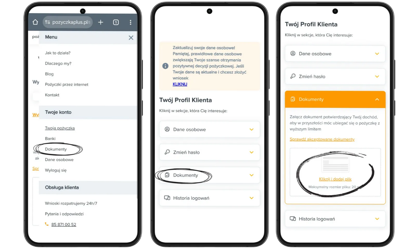 UWAGA! Dokumenty potwierdzające wysokość Twoich dochodów możesz załączyć jeszcze przed złożeniem wniosku o pożyczkę w wyższej kwocie, dzięki czemu w przyszłości proces aplikacji przebiegnie sprawniej. Możesz to zrobić logując się do swojego profilu w strefie klienta i wchodząc w zakładkę “Dane osobowe”. Dodanie dokumentu jest bardzo proste zarówno na telefonie, jak i na komputerze.
